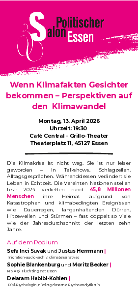 Auf dem Podium treffen sich Perspektiven aus Oral-History Erzählungen auf Flüchtlingsarbeit und Klimapsychologie. Es geht um Handlungsfähigkeit und um die Frage, wie ein öffentlicher Diskurs aussehen kann, der nicht nur über „Zahlen und Ziele“ spricht, sondern über Menschen, Erfahrungen und Konsequenzen.